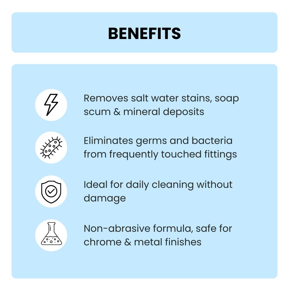 - Restores shine to taps, showers & chrome fixtures